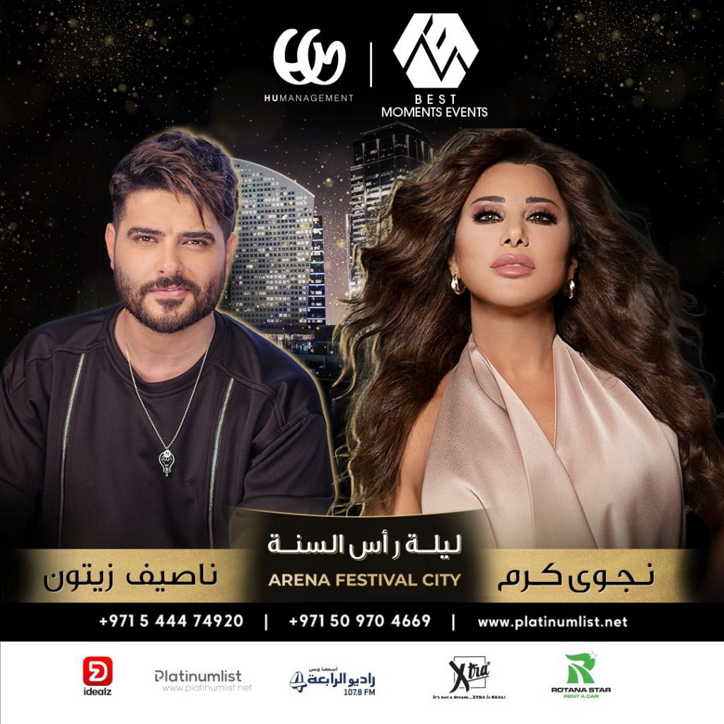 تستعد النجمة اللبنانية نجوى كرم لإحياء حفل جماهيري كبير بمشاركة النجم السوري ناصيف زيتون على مسرح “فيستيفال أرينا” في فندق إنتركونتيننتال في دبي ليلة 31 كانون الأول/ديسمبر بمناسبة رأس السنة الميلادية بتنظيم من شركة “بيست مومنت إيفنت”.