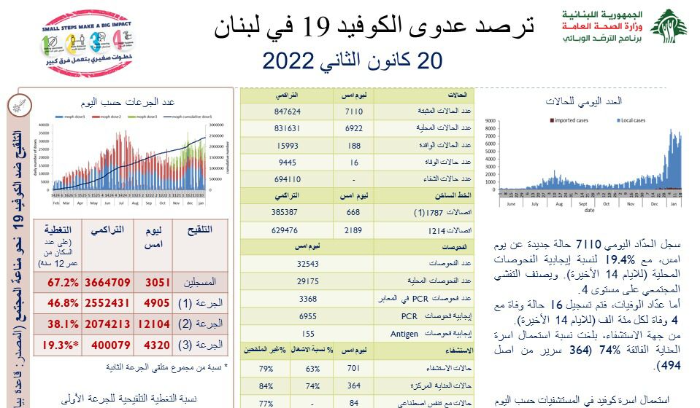 أعلنت وزارة الصحة العامة اللبنانية في تقريرها اليومي تسجيل ” 7110 إصابات جديدة بفيروس كورونا رفعت العدد التراكمي للحالات المثبتة الى 847624 ، كما تم تسجيل 16 حالة وفاة”.