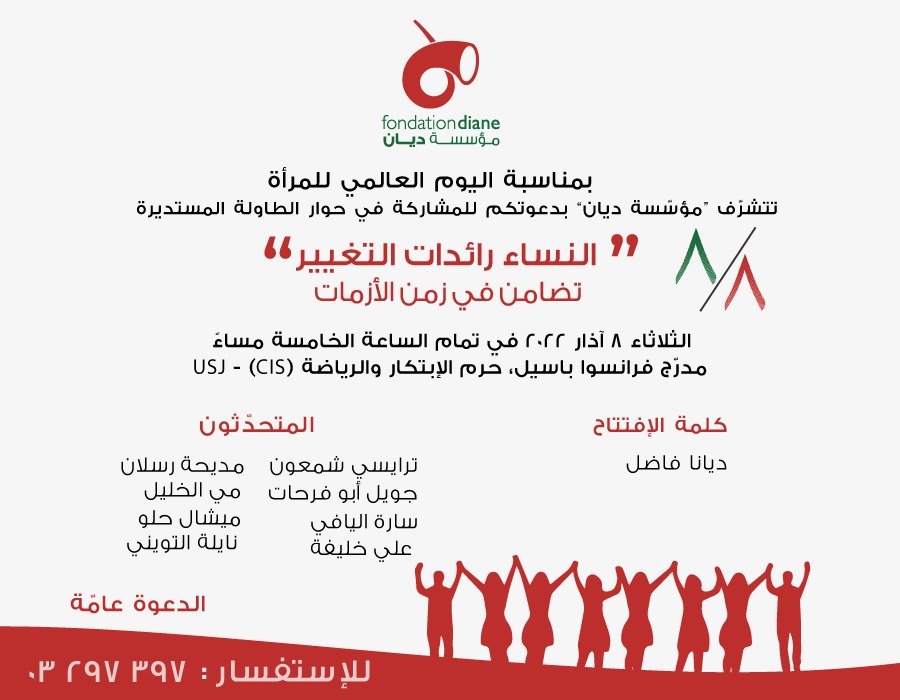 بمناسبة اليوم العالمي للمرأة، تتشرّف “مؤسسة ديان” بدعوتكم للمشاركة في حوار الطاولة المستديرة تحت عنوان “8/8 النساء رائدات التغيير، تضامن في زمن الأزمات”، وذلك يوم الثلاثاء 8 آذار 2022 في تمام الساعة الخامسة مساءً في جامعة القديس يوسف USJ – مدرّج فرانسوا باسيل، حرم الإبتكار والرياضة CIS