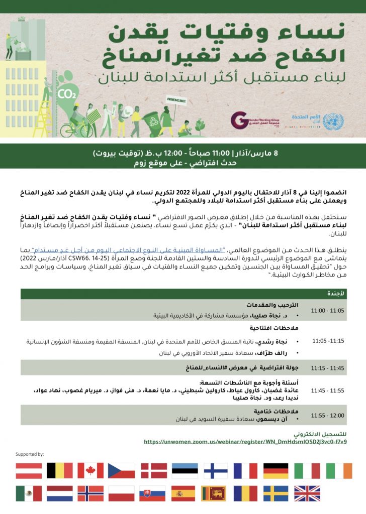 8 مارس/آذار | 11:00 صباح ًا – 12:00 ب.ظ )توقيت بيروت( حدث افتراضي – على موقع زوم انضمـوا إلينـا فـي 8 آذار للاحتفـال باليـوم الدولـي للمـرأة 2022 لتكريـم نسـاء فـي لبنـان يقـدن الكفـاح ضـد تغيـر المنـاخ ويعملـن علـى بنـاء مسـتقبل أكثـر اسـتدامة للبـلاد وللمجتمـع الدولـي. mediasolutionslb مارس 4, 2022 Uncategorized, مؤتمرات اضف تعليق 2,946 زيارة مقالات مشابهة جامعة رفيق الحريري تهنيء اللبنانيين بعيد الفصح المجيد أسبوعين مضت الصحافة اليوم الثلاثاء 31 آذار 2026 3 أسابيع مضت “كتاب الجفر” واسرائيل و”اليوم التالي” لدول الخليج ولبنان 3 أسابيع مضت شاركها Facebook Twitter Stumbleupon LinkedIn Pinterest