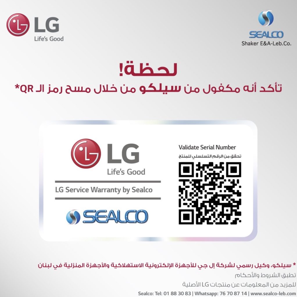 أما الخطوات التي يجب على المستهلكين القيام بها للتحقق من كون المنتج أصلياً ومكفولاً فهي الآتية:1. قبل شراء أي منتج من “إل جي” تأكدوا من وجود رمز QR Codeعليه.2. إمسحوا الرمز للتحقق عن طريق الموبايل، أو زوروا موقع “Sealco” الإلكتروني.3. أدخِلوا الرقم المتسلسل للمنتج.4. تأكدوا ما إذا كان المنتج أصلياً وبالتالي مكفولاً من “Sealco” أم لا. وفي حال لم تجدوا الرمز على المنتج فلا داعي للقلق، إذ يمكنكم الاتصال بـ”SEALCO” على الـ01883083 أو التواصلمع الشركة عبر تطبيق WhatsApp على الرقم 76708714 لمزيدٍ من المساعدة، أو على خط “إل جي” الساخن 1273.