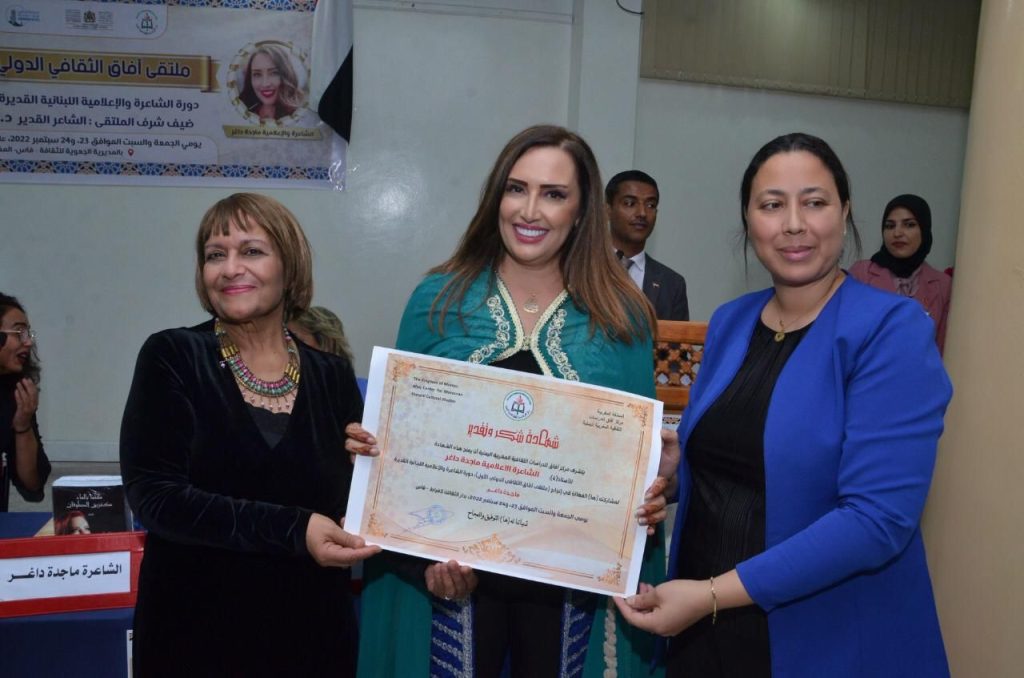 بعدها تم تكريم الشاعرة الإعلامية اللبنانية ماجدة داغر بدروع التكربم والهدايا، ثم ألقت كلمتها بهذه المناسبة مع قصيدة شعرية عن المغرب.