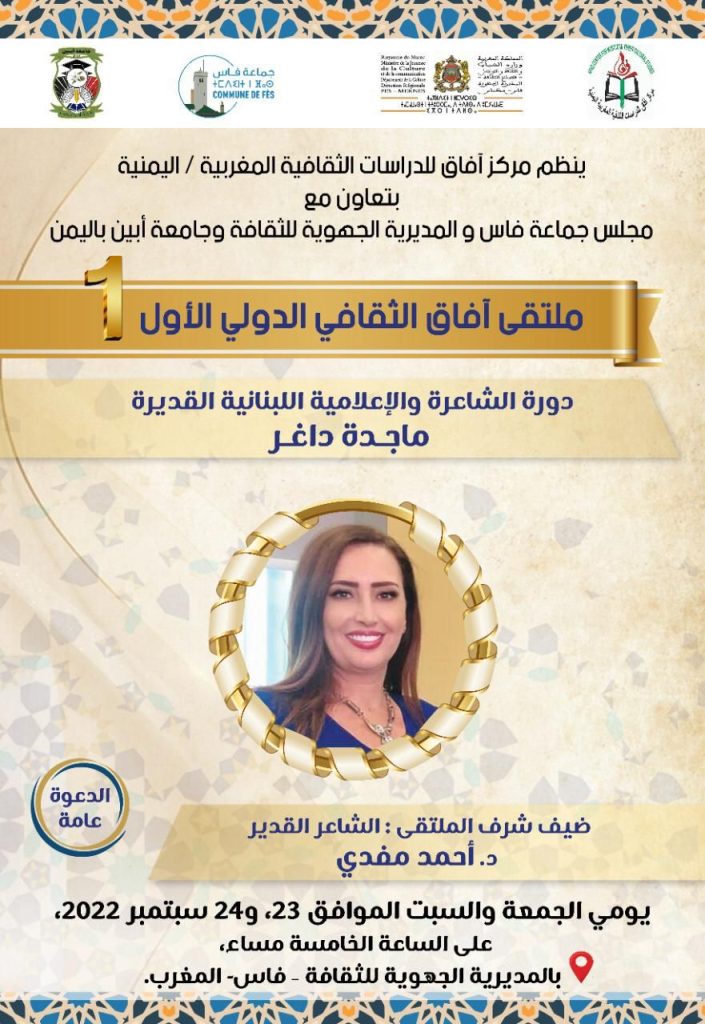 نظم مركز آفاق للدراسات الثقافية المغربية اليمنية يومي الجمعة والسبت الموافق 23 و24 سبتمبر بتعاون مع جماعة فاس والمديرية الجهوية للثقافة بفاس وجامعة أبين في الجمهورية اليمنية في القاعة الكبرى للمديرية الثقافية فاس بالمملكة المغربية. (ملتقى آفاق الثقافي الدولي الأول – دورة الشاعرة والإعلامية اللبنانية ماجدة داغر) وحلّ ضيف شرف الملتقى الدكتور الشاعر العربي أحمد مفدي.