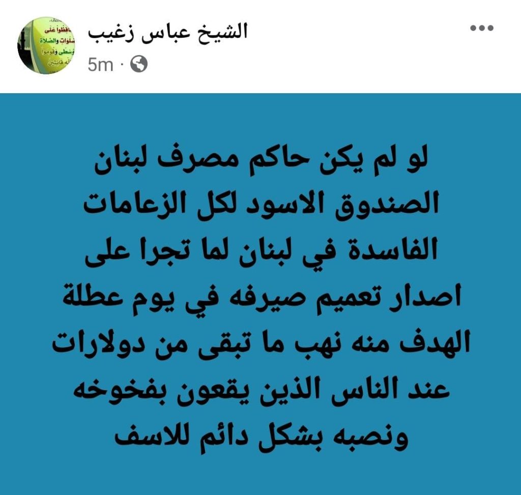 غرد المفتي الشيخ عباس زغيب على حسابه على وسائل التواصل الإجتماعي بالقول : لو لم يكن حاكم مصرف لبنان الصندوق الاسود لكل الزعامات الفاسدة في لبنان لما تجرا على اصدار تعميم صيرفه في يوم عطلة الهدف منه نهب ما تبقى من دولارات عند الناس الذين يقعون بفخوخه ونصبه بشكل دائم للاسف.