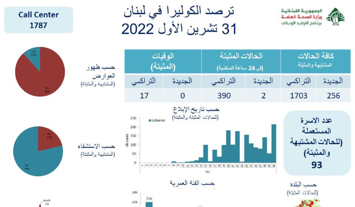 أعلنت وزارة الصحة العامة في تقرير مساء اليوم عن حالات الكوليرا في لبنان، تسجيل” اصابتين جديدتين في الساعات ال24 الماضية ، رفعت العدد التراكمي للحالات المثبتة الى 390 ، فيما لم يتم تسجيل اي حالة وفاة، وسجل العدد التراكمي للوفيات 17″.