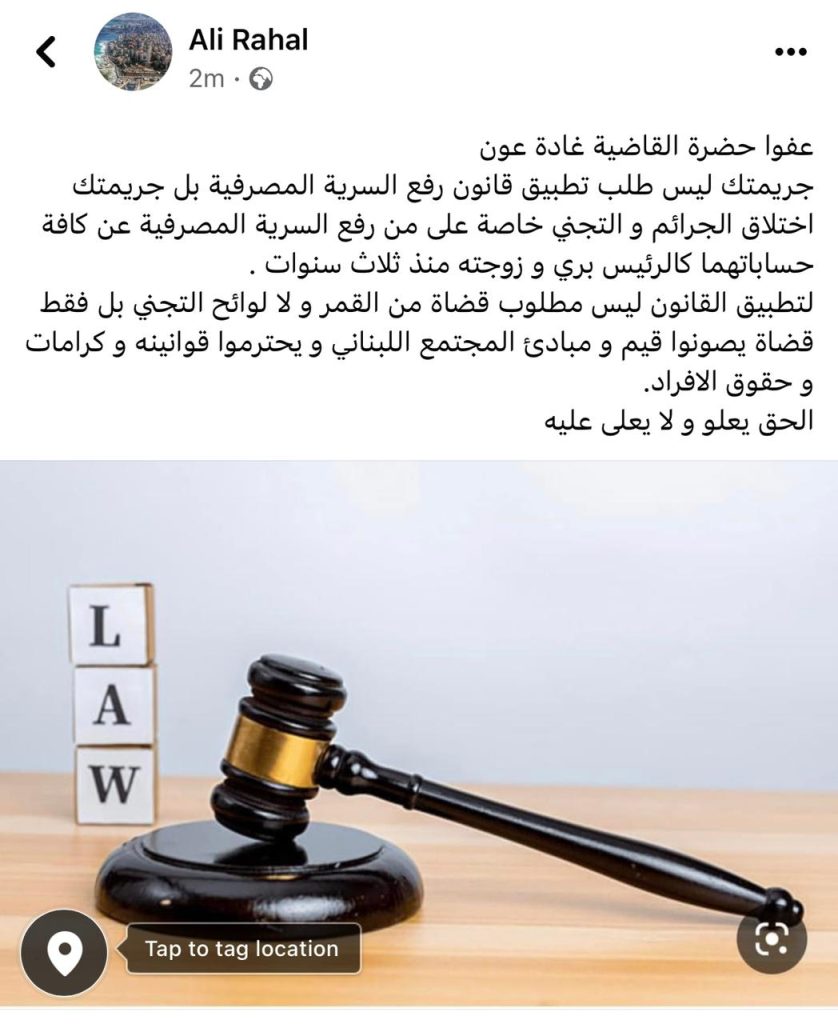 رد البروفسور المحامي علي رحال على تغريدة جديدة للقاضية غادة عون اعلنت فيها ان جريمتها طلب تطبيق قانون رفع السرية المصرفية