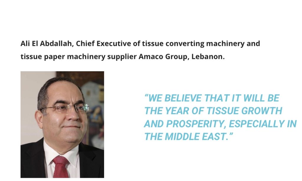 أجرت مجلة Tissue World Magazine، وهي من أبرز المجلات العالمية الرائدة في قطاع الورق الصحي، مقابلة مع رئيس مجموعة أماكو اللبنانية – العالمية علي محمود العبد الله وذلك في إطار تقريرها السنوي الخاص بصناعة الورق الصحي حول العالم. وحمل هذا التقرير الخاص عنوان “المراجعة السنوية للعام 2022”. وشملت المقابلات في هذا التقرير إضافة إلى العبد الله، ثلاثة من كبار قادة صناعة الورق الصحي العالمي. وتناول اللقاء مع العبد الله مختلف المستجدات والتطورات في صناعة الورق الصحي، إضافة إلى التوجهات التي تشهدها منطقة الشرق الأوسط. وهنا أبرز ما جاء في اللقاء مع العبد الله: