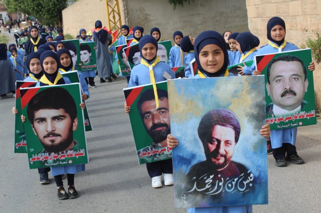 الاحتفال استهل بمسيرة شعبية وكشفية حاشدة جابت شوارع البلدة شارك فيها زهرات ومرشدات من كشافة الرسالة الاسلامية حملن صور الشهداء .