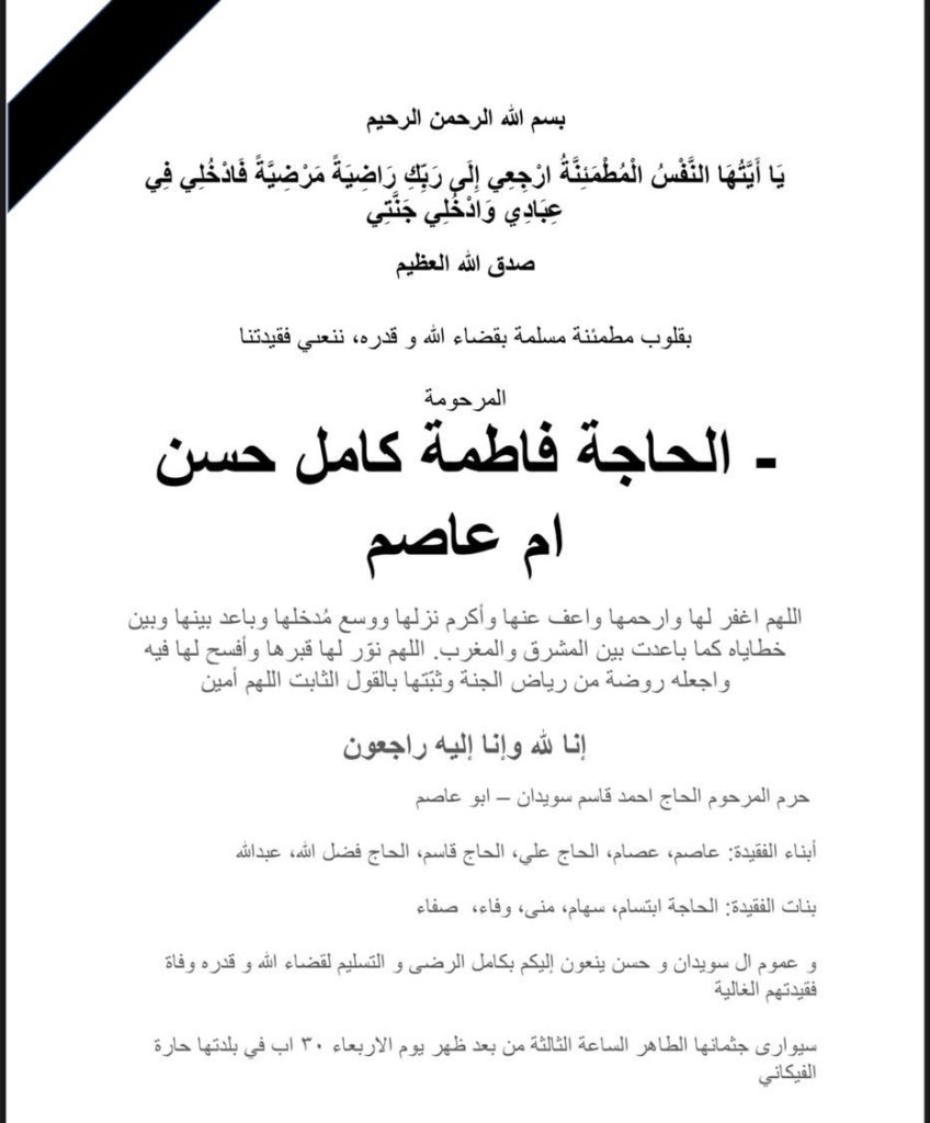 غيب الموت صباح اليوم الحاجة فاطمة كامل حسن “ام عاصم” والدة العزيز الحاج علي سويدان بعد صراع مع المرض