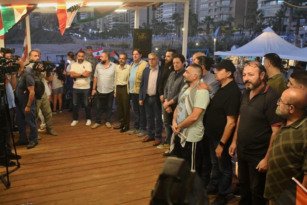 بعد النشيدين اللبناني والفلسطيني، كلمة للنقيب علي علوش أكد فيها أن الإعلام بعامة والمصورين بخاصة سيستمرون بالقيام بمهامهم لكشف جرائم العدو ولن يغادروا الساحات في الجنوب.