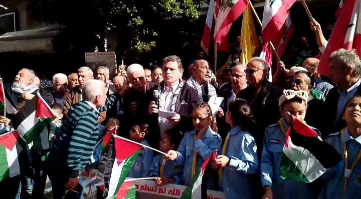 وكانت كلمة لأمين سر فصائل منظمة التحرير الفلسطينية في بيروت العميد سمير أبو عفش، بدأها بنقل التحيات من الشعب الفلسطيني الصامد في غزة والضفة الغربية والقدس إلى أهلهم في لبنان، مؤكداً أن لا خيار اليوم أمام الشعب الفلسطيني إلا الصمود في وجه هذا الإحتلال الذي لا يتوقف عن قتل المدنيين منذ العام 1948 حتى يومنا هذا.