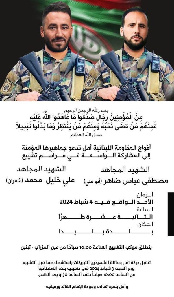 أعلنت حركة “أمل”، في بيان لها، أنّه “بمزيدٍ من الفخر والإعتزاز تزفّ أفواج المقاومة اللبنانية “أمل” إلى قائدها الإمام السيد موسى الصدر وجماهيرها المؤمنة الشهيد المجاهد علي خليل محمد (شمران) مواليد بليدا والشهيد المجاهد مصطفى عباس ضاهر (أبو علي) مواليد بليدا”، اللذيين “استشهدا أثناء قيامهما بواجبهما الوطني والجهادي دفاعا عن لبنان والجنوب”.