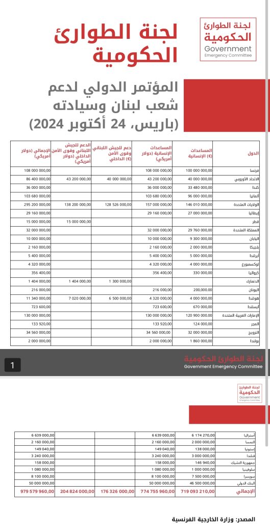 كما تمّت مناقشة العمل على تحديد آلية التنسيق مع الجهات المانحة بالتعاون بين لجنة الطوارئ الحكومية والأمم المتحدة في لبنان وبالتنسيق مع وزارة الخارجية الفرنسية، الجهة الداعية للمؤتمر، وذلك لمتابعة توزيع التعهدات على القطاعات الإنسانية المختلفة، وبحث سبل تعزيز دور الوزارات المعنية في تقديم الخدمات الأساسية والاجتماعية خلال حالة الطوارئ الإنسانية المستجدة نتيجة العدوان على لبنان.
