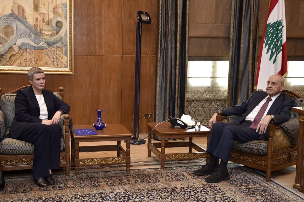 الرئيس بري عرض أيضاً الاوضاع العامة والمستجدات السياسية والميدانية على ضوء الخروقات الاسرائيلية المتواصلة لبنود إتفاق وقف اطلاق النار اضافة للوضعين المالي والاقتصادي والتشريعات المتصلة بهما ، وذلك خلال لقائه سفيرة الإتحاد الأوروبي في لبنان ساندرا دو وال .