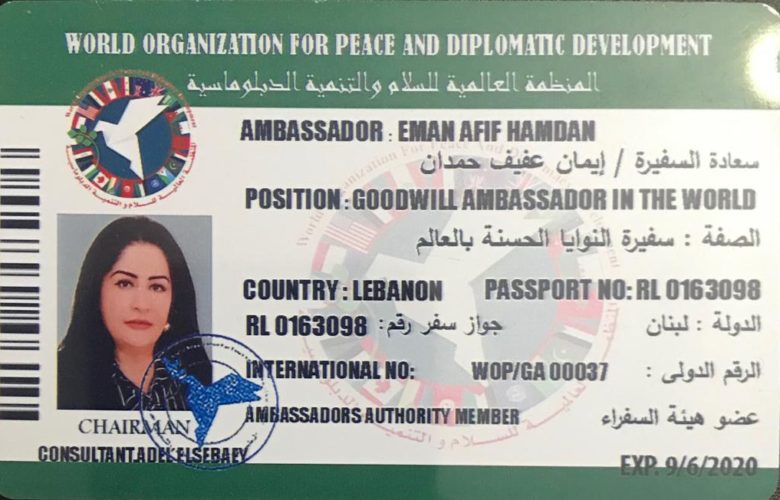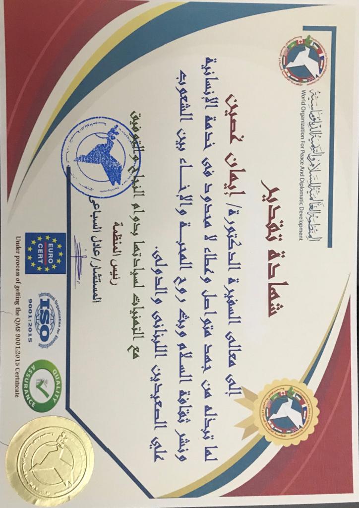 بعد الاطلاع على اللائحة الداخلية للمنظمة وبما يتفق مع ميثاق الأمم المتحدة لحقوق الانسان لعام ١٩٤٥ والاعلان العالمي لحقوق الانسان لعام ١٩٤٨ والعهد الدولي للحقوق المدنية والانسانية لعام ١٩٦٦ وقانون حقوق الانسان بالممكلة المتحدة لعام ١٩٩٨ قررت المنظمة العالمية للسلام والتنمية الدبلوماسية ممثلة برئيسها المستشار عادل السباعي بتكليف معالي السفيرة ايمان غصينً بمنصب سفير النوايا الحسنة في العالم وتم هذا التكريم في نادي الصحافه في بيروت بحضور عدد الاعلاميين وذلك لجهودها الاجتماعية والثقافية وخاصة في دعم وتمكين المرأة العربية وبناء عليه تتمتع معاليها بكافة الحصانات القانونية المنصوص عليها في المواثيق والمعاهدات الدولية السابقه ولها حق تمثيل المنظمة في كافة المحافل الدولية المتعلقة بالعمل الخدمة والانساني كسفيرة لها ومعبرة عن مبادئها كما تم تعيينها عضو هيئة السفراء للمنظمة لما تحمله من معاني سامية وروح وطنيه صادقه ،كما قدمت المنظمة كتاب شكر وتقدير للدكتورة ايمان غصين لما تبذله من جهد وعطاء لا حدود له في خدمة الانسانية ونشر ثقافة السلام وبث روح المحبة والاخاء بين الشعوب على الصعيد اللبناني والدولي مع التمنيات لسيادتها بدوام النجاح والتوفيق.