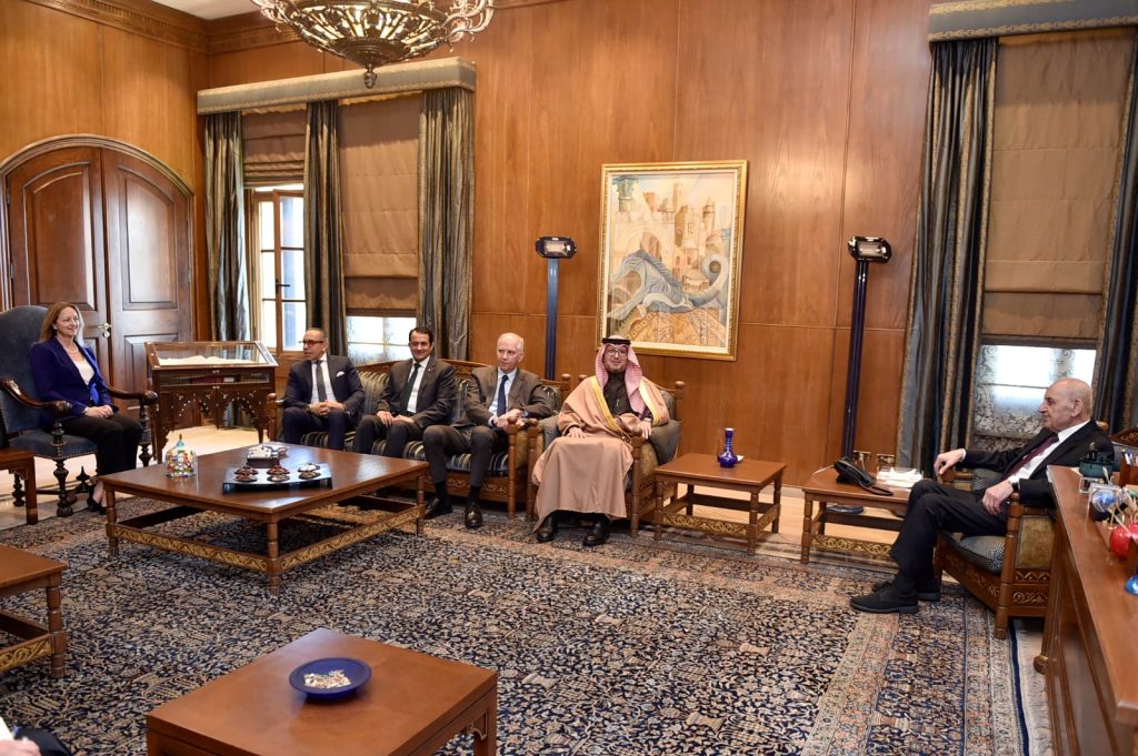 إستقبل رئيس مجلس النواب نبيه بري في مقر الرئاسة الثانية في عين التينة سفراء “اللجنة الخماسية”: سفير المملكة العربية السعودية وليد البخاري، سفيرة الولايات المتحدة الاميركية ليزا جونسون ، السفير الفرنسي هيرفي ماغرو، سفير دولة قطر الشيخ سعود بن عبدالرحمن بن فيصل آل ثاني وسفير جمهورية مصر العربية علاء موسى بحضور المستشار الإعلامي لرئيس المجلس علي حمدان ، اللقاء جرى خلاله عرض لتطورات الأوضاع العامة في لبنان والمنطقة والمستجدات السياسية والميدانية على ضوء مواصلة خرقها لبنود وقف إطلاق النار والقرار ١٧٠١ .