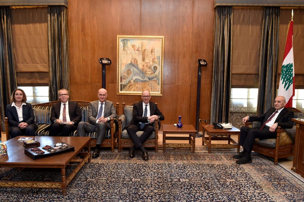وبعد الظهر إستقبل الرئيس بري الوكيل البرلماني للوزيرة الإتحادية للتعاون الإقتصادي والتنمية في جمهورية المانيا الإتحادية نيلز إنن والوفد المرافق بحضور السفير الألماني لدى لبنان كورت غيورغ شتوكل شتيلفريد حيث جرى عرض للاوضاع العامة والمستجدات في لبنان اضافة للعلاقات الثنائية بين جمهورية المانيا الإتحاد ولبنان والتعاون بين برلماني البلدين .
