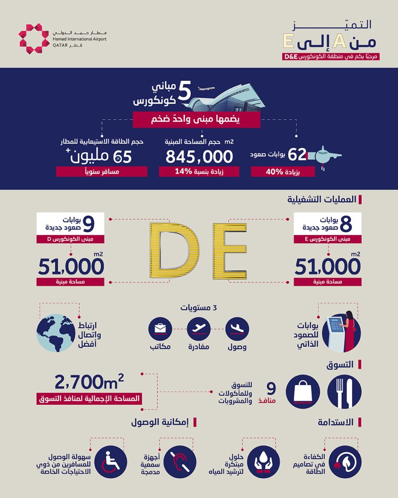 وقد تعززت بفضل هذه التوسعة تجربة السفر عبر المطار وكذلك المكانة الرائدة لمدينة الدوحة باعتبارها مركزاً عالمياً للطيران. وبافتتاح المنطقتين (D) و(E) اكتمل مشروع التوسعة الذي انطلقت أعماله في عام 2018، مما يمثل تتويجاً رائعاً لخطة التطوير الطموحة التي شهدها المطار.