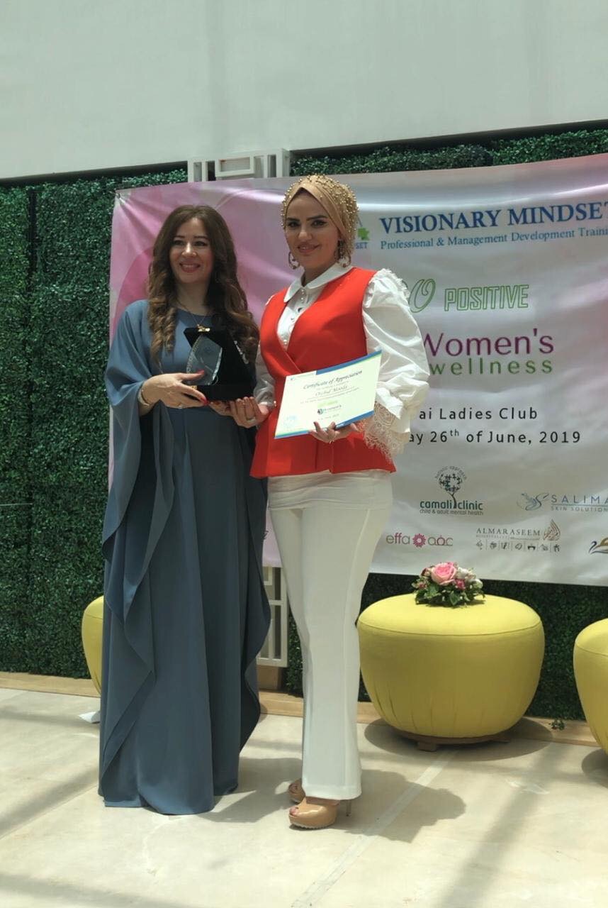 تكريم الدكتورة أميمة أحمد سلايمة سفيرة النوايا الحسنة و سفيرة السلام من مركز فيجنري مايندست التدريبي و ذلك لدورها في دعم مرضى السرطان و مشاركتها في حضور الندوة المقامة في نادي سيدات دبي .