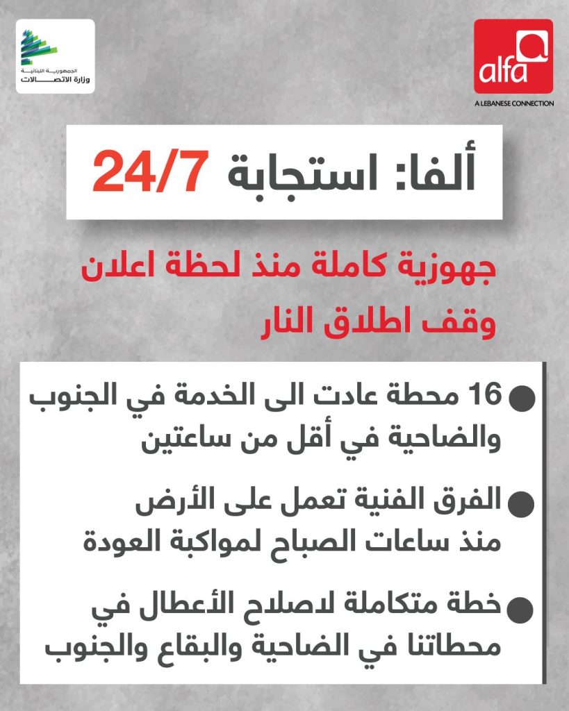 فعّلت شركة ألفا خطة الاستجابة 24/7 منذ لحظة اعلان وقف اطلاق النار، وعملت فرقها الفنية منذ ساعات الصباح الأولى على مواكبة عودة النازحين لضمان تأمين الخدمة لهم.